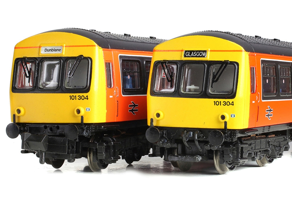 The Graham Farish model of the Class 101 three car Diesel Multiple Unit (DMU) captures the character of these first generation DMUs to a tee. Featuring detailed bodywork and interiors, the bogies have been finely rendered and all of the chassis-mounted equipment is present and correct too. The exquisite livery application is the icing on the cake for this N scale model, with the verdant paintwork enhanced by authentic numbers and logos to produce a multiple unit fit for any Scottish fleet. Mechanically, the model is driven by a three pole motor with flywheel and directional lighting is fitted to both end vehicles, DCC provision comes in the form of two 6 Pin DCC decoder sockets or why not opt for our SOUND FITTED model for even more realism!