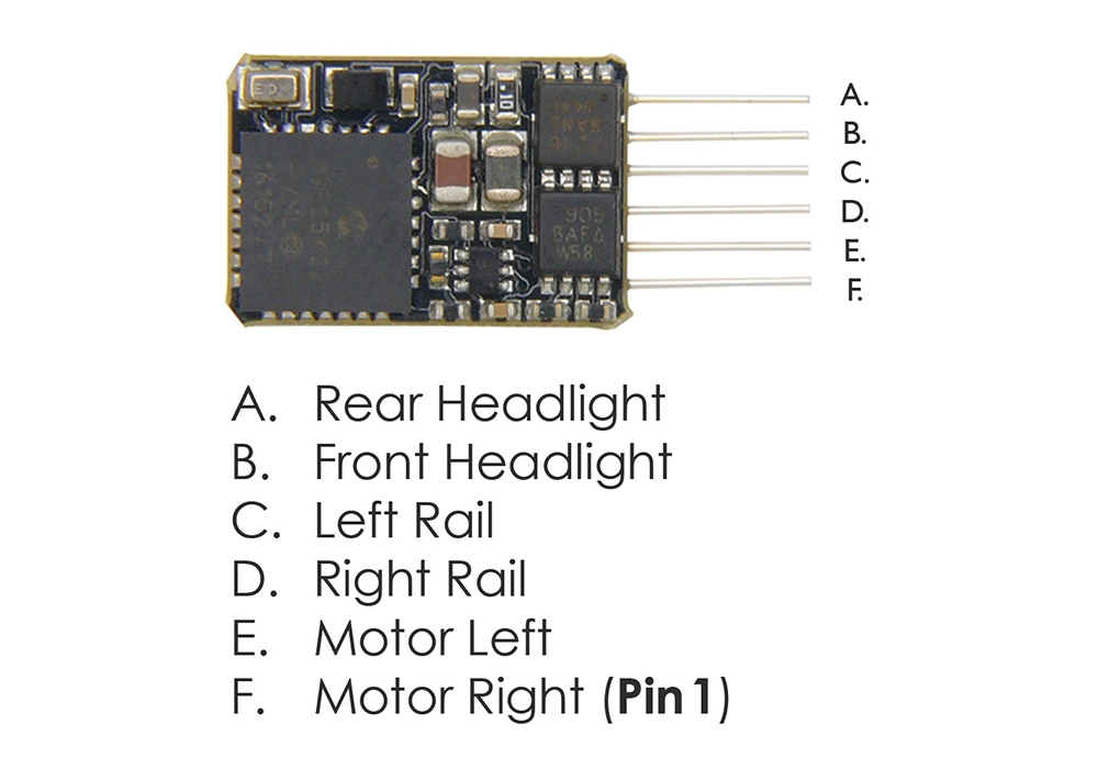 A 6 Pin (NEM651) DCC Decoder suitable for models fitted with a 6 Pin DCC decoder socket (do not use with the Graham Farish 3F ‘Jinty’ and Class 64XX Pannier Tank – use 36-556RA with these models).